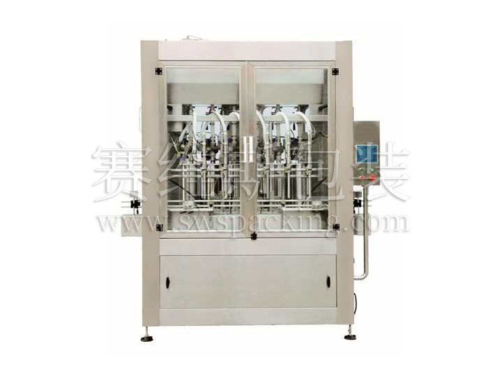 該機爲伺服電機驅動的柱塞式灌裝機,實行自動進瓶、變速(可設定)灌裝、自動出瓶。